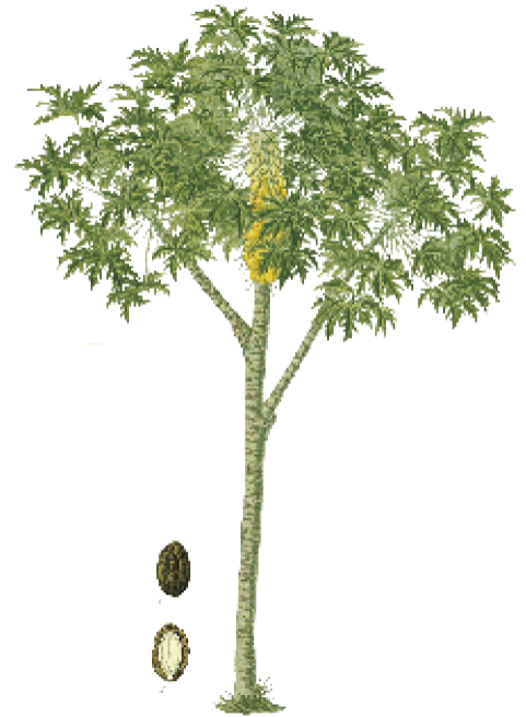 番木瓜果实中含木瓜蛋白酶、维生素C、维生素A等。其中的木瓜蛋白酶是多种酶的组合,有助消化,可以分解蛋白质、糖类、脂肪等。