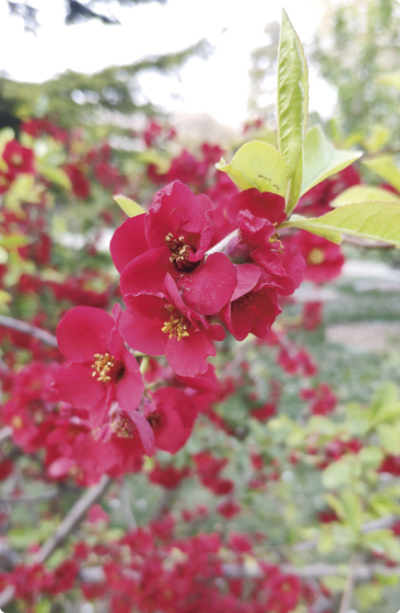 这种木瓜别名为贴梗海棠、贴梗木瓜、铁脚梨、皱皮木瓜等,为蔷薇科木瓜属落叶灌木或小乔木,高可达2米。枝条直立开展,有刺;小枝圆柱形,无毛,紫褐色或黑褐色,有疏生浅褐色皮孔。叶片卵形至椭圆形,先端急尖稀圆钝,基部楔形至宽楔形,边缘具有尖锐锯齿,齿尖开展,无毛或在萌蘖上沿下面叶脉有短柔毛。花先叶开放,3~5朵簇生于两年生老枝上;花瓣倒卵形或近圆形,基部延伸成短爪,猩红色,少数呈稀淡红色或白色。果实球形或卵球形,色黄而香,且其上有稀疏不显明斑点。花期在3~5月,果期在9、10月。