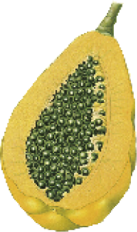 番木瓜为番木瓜科番木瓜属常绿小乔木,高可达8~10米,有乳汁;茎不分枝,具螺旋状排列的托叶痕。叶大,聚生于茎顶端,近盾形,通常具5~9深裂,每裂片再为羽状分裂;叶柄中空。花单性或两性,植株有雄株、雌株和两性株。雄花排列成圆锥花序,长达1米,下垂;花无梗;花冠乳黄色。雌花单生或由数朵排列成伞房花序,着生于叶腋内;具短梗或近无梗;花冠乳黄色或黄白色。两性花有雄蕊5枚或10枚,且排列成2轮;花冠裂片长圆形。浆果肉质,成熟时为橙黄色或黄色,长圆球形或近球形,果肉柔软多汁,味香甜。种子多数,卵球形,成熟时为黑色,外种皮肉质,内种皮木质,具皱纹。花果期为全年。